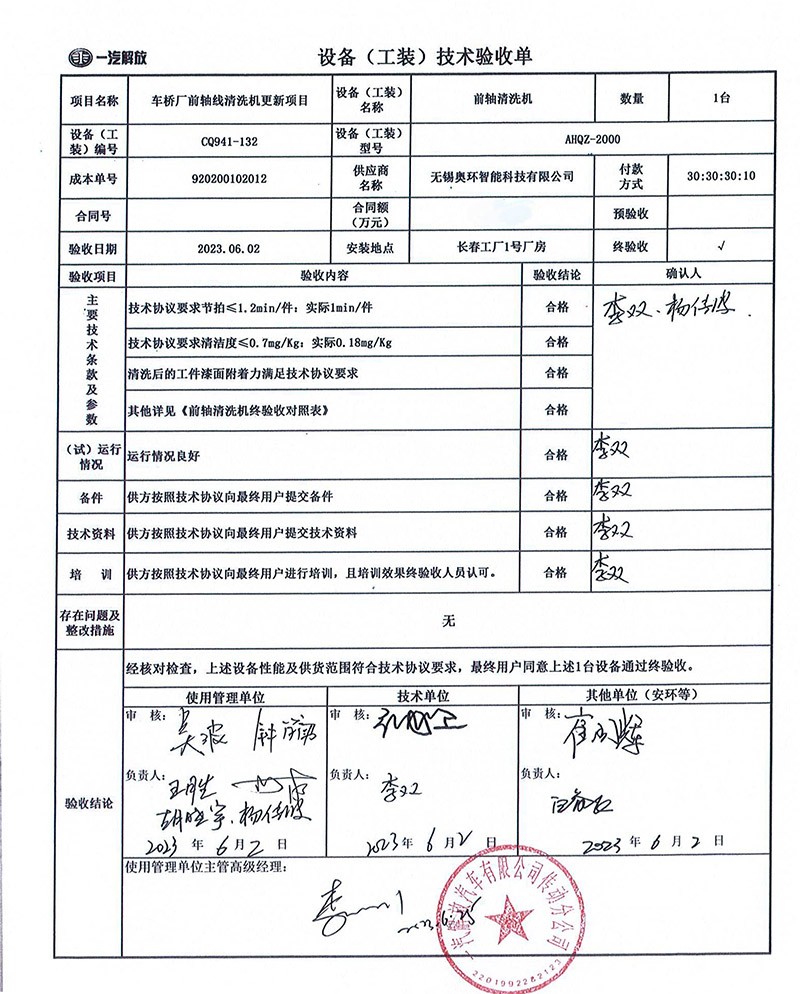前軸線清洗機(jī)在一汽解放長(zhǎng)春工廠1號(hào)廠房投產(chǎn)